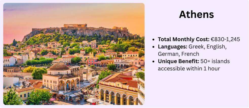 Lifestyle Bonus: Athens provides the unique combination of urban work environment with island hopping capabilities. Friday afternoon trips reach dozens of Greek islands in under an hour.
