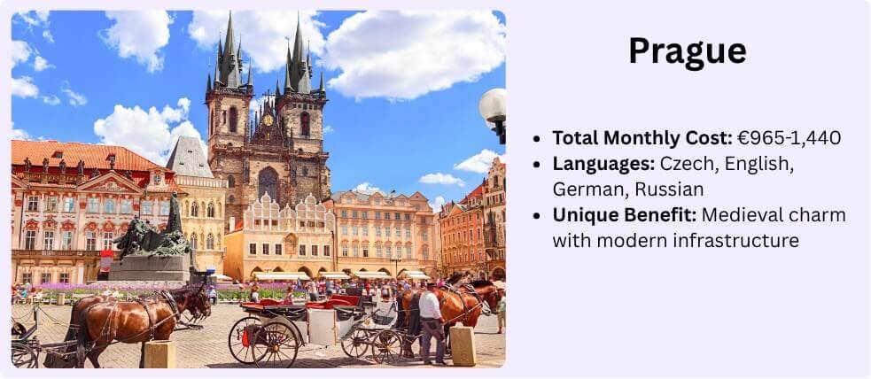 Digital Infrastructure: Fast, reliable internet throughout Prague. Growing coworking scene. Mobile data plans remain extremely affordable.