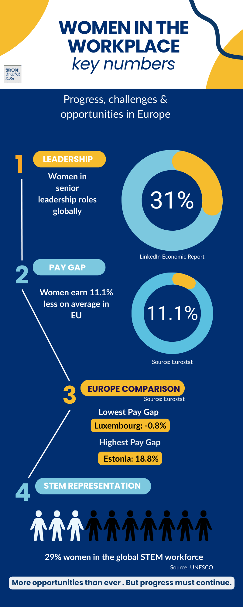 Even though women have gained more access to education, careers, and leadership positions, pay equality is still an important issue in the modern workplace. Across Europe, women on average still earn less than men.