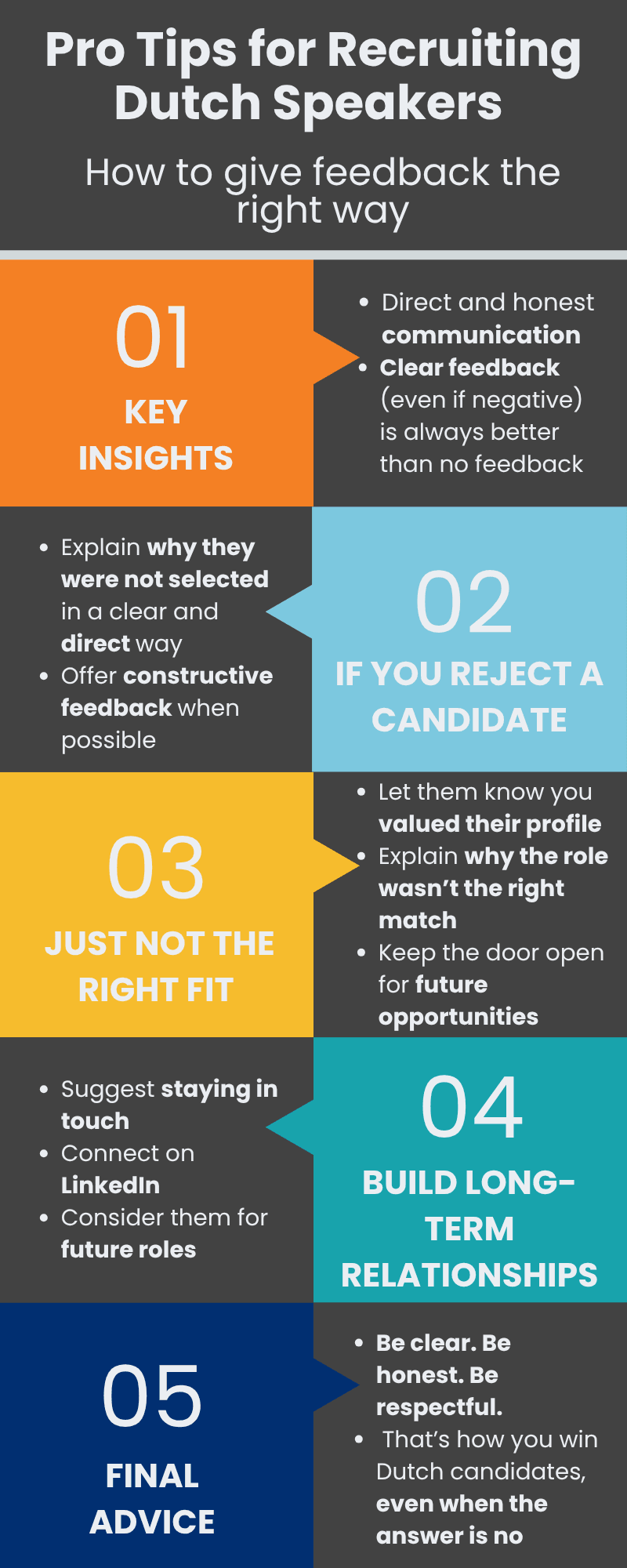 Dutch professionals value efficiency, structure, and respect for their time. If the process takes too long or lacks communication, they are likely to lose interest or accept another offer.