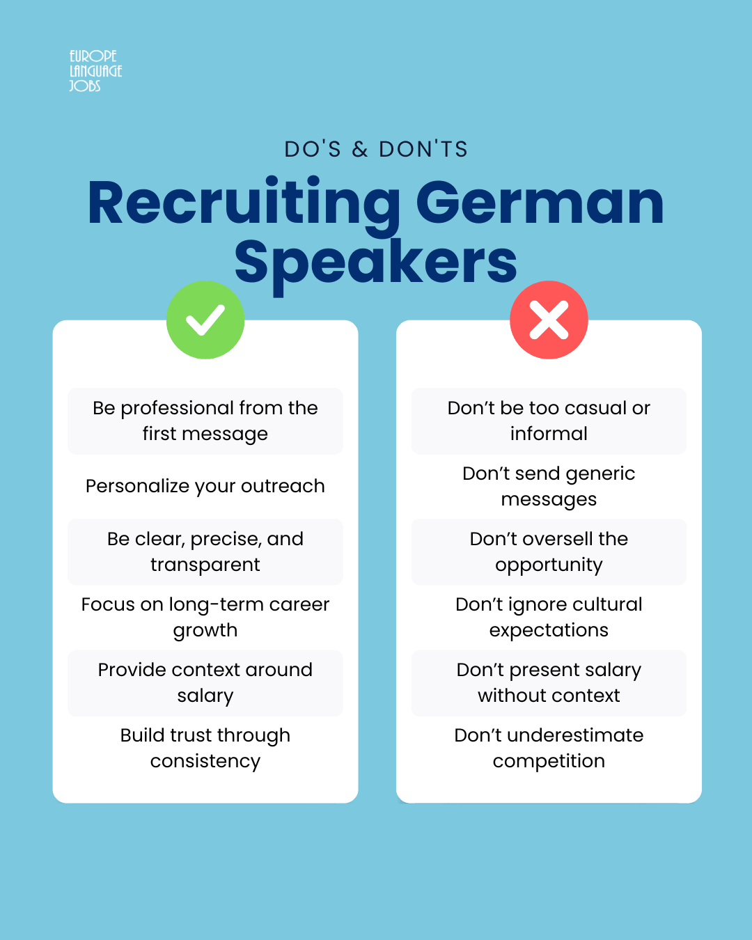 One of the most common mistakes recruiters make is approaching German-speaking candidates with overly casual communication styles. While this may work well in more Southern European markets where the communication style is more informal, it can be perceived as unprofessional or even disrespectful in this context for Germans.
