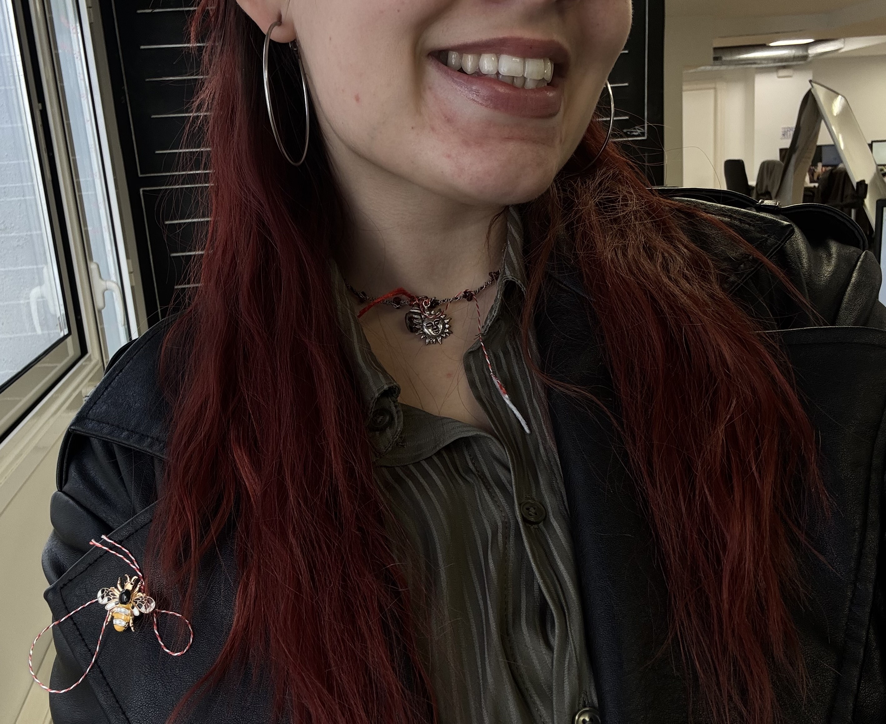 I love this tradition so much that I actually brought my own mărțișoare. That’s a picture of me wearing them in the office!