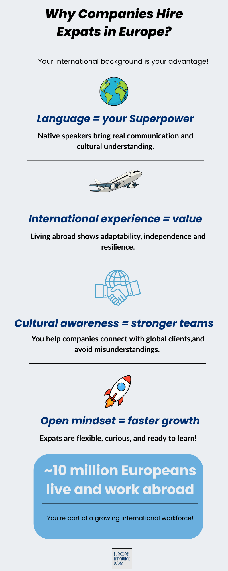 For companies hiring for jobs abroad in Europe, this is extremely valuable. Miscommunication can cost time, money, and even business relationships. Having someone on the team who understands multiple cultures helps avoid that.
