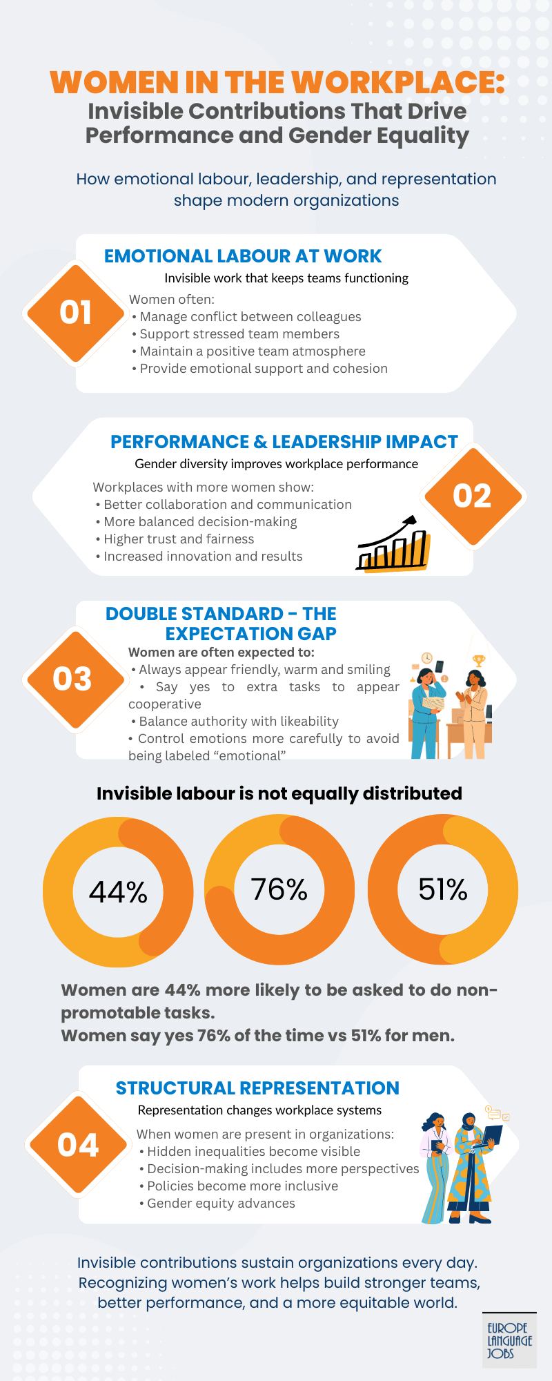 Over time, this shapes workplace culture itself. A functional, respectful environment does not appear by chance, it’s maintained through constant emotional effort. By managing stress, preventing conflict escalation, and supporting colleagues, women contribute to stability and cooperation, demonstrating how emotional labour quietly sustains everyday professional life. These are not only “some soft skills”, they are core professional skills that hold teams together.